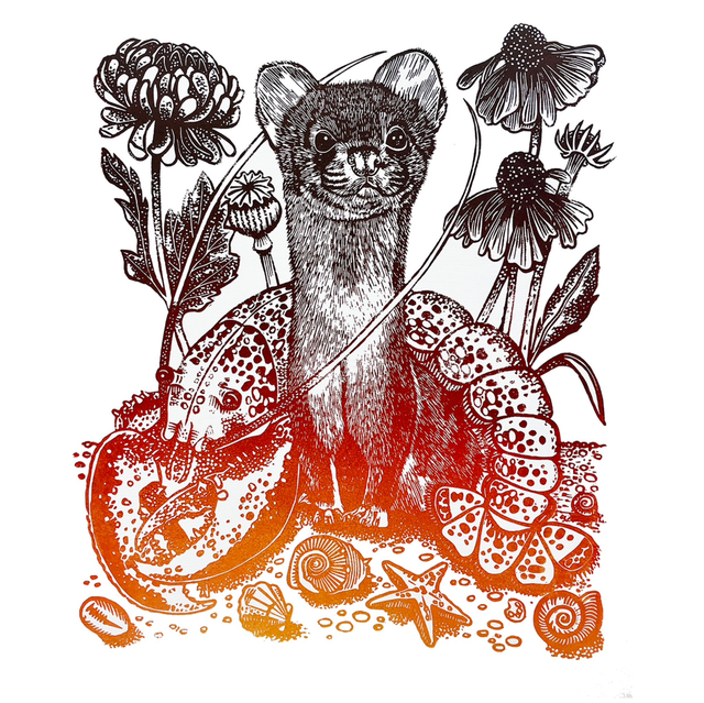 Original, hand printed open edition linocut of Lobster and Weasel, inspired by Poco Drom’s song Along Came A Weasel